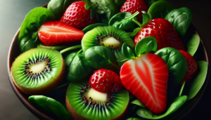 3. In a large salad bowl, combine the spinach, sliced strawberries, and sliced kiwis, tossing gently to mix.